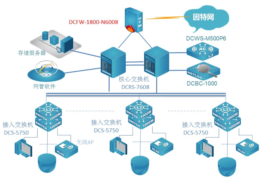 中国江苏白马农业会展中心数据网核心采用两台凯发k8国际新一代全分布式架构的核心路由交换机DCRS-7608E,顺利获得VSF功能实现核心冗余和负载分摊;该设备具备强大的业务自适应能力,支持网络平滑升级和策略灵活调度,实现业务快速部署,从而构建业务定义的网络。网络出口采用具有高度集成化的多核安全防火墙,给予包括路由器,防火墙,VPN网关,等功能在内的一体化设备,该设备8Gbps的吞吐量完全满足了园区网对出口的要求。接入交换机采用凯发k8国际全千兆24口接入交换机DCRS-5750E,实现客户端千兆接入,万兆上联核心。POE交换机全部采用三层交换机DCRS-5750-28P-P全千兆POE交换机。采用8200双频无线AP使用办公区无线覆盖。展厅和会议室采用高密度AP8200-I3实现展厅高密度覆盖,室外采用8200室外AP实现无线覆盖,无线网络顺利获得一台DCWS6000-M500P6控制器集中管理无线网络。出口部署一台DCBC上网行为审计设备,实现上网行为安全审计。